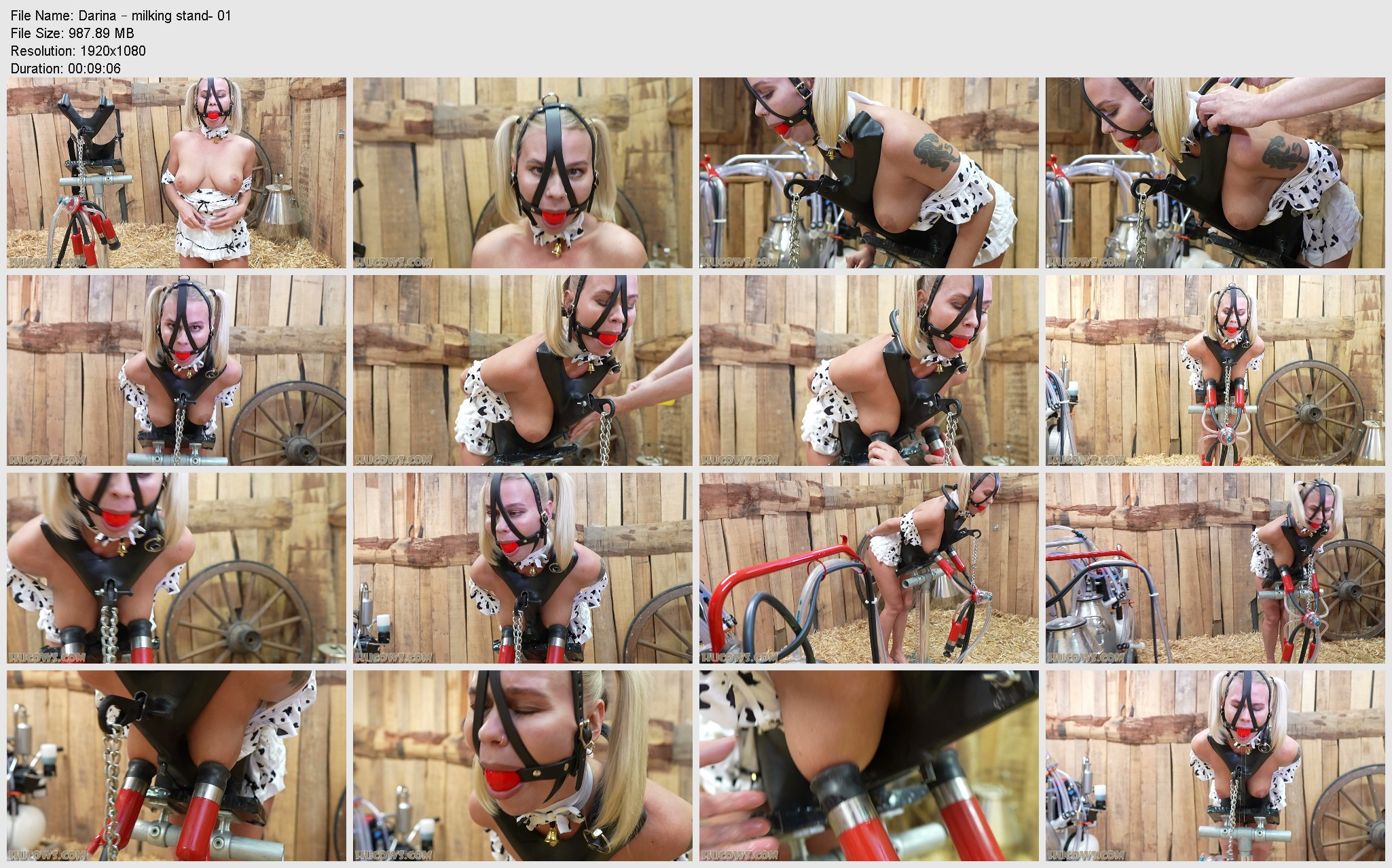 Darina has been in the herd for 10 years now. Click here to see all of her updates! She has never been pumped on the milking stand, so it is time she is locked down and milked on this custom made frame. The milking stand fits around a HuCow’s body tightly, making her bend over by using a waist strap and a neck bar. The udders still hang free, which gives the farmer the option to use any milking machine he likes. Of course, for a veteran HuCow like Darina, it is the most powerful machine: the red cow milker. Darina is milked very hard in this inescapable frame. You can tell it’s painful by her cute mooing sounds. This is a hard position and very high vacuum power! To make matters worse, the session is ended with a pair of painful clover clamps on Darina’s ultra sensitive teats!