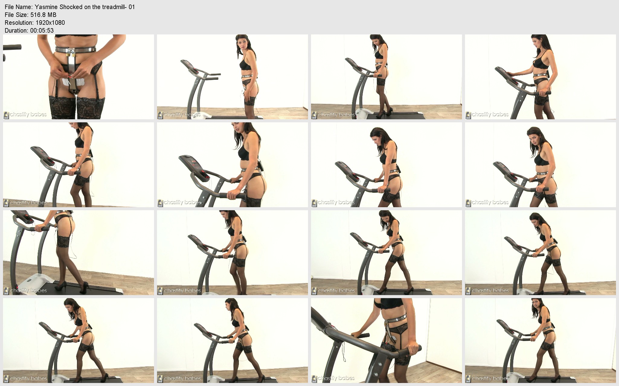 Walking fast in high heels on a treadmill is not easy. It is actually a bit dangerous. Then add a chastity belt to that, and it is already a good Challenge, as we have seen before. Now add a mad guy with a remote control and this has really become a case of ‘do-not-try-this-at-home’!! It is very hard for Yasmine to keep her step when she is shocked, and each time I increase the intensity. She loses her rhythm with every shock, and has to regain her balance in her high heels to avoid any serious accidents.